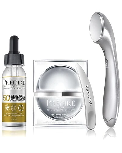 - Predire Paris Age Defying Set with one-of-a-kind skincare infuser is a gentle non-surgical treatment that harnesses the power of positive and negative ions to penetrate deeply into the skin, expel impurities and increase collagen and oxygen production, diminishing fine lines and wrinkles, revealing smoother, brighter and younger looking skin! The set is designed with a collection of high-quality superior ingredients scientifically tested in the Predire laboratory in France. Benefits: Diminishes Fine Lines & Wrinkles, Correcting Uneven Skin Tone, Improving Elasticity, Firming, Pore Cleansing, Reducing Redness & Puffiness, Boosting Collagen Production, Exfoliate and Purify the Layers of the Skin