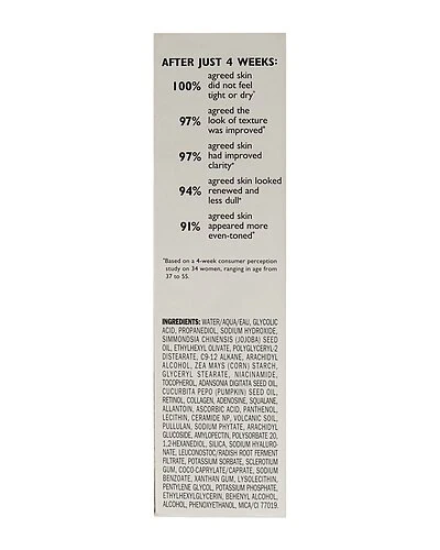 - Active ingredients: Water/Aqua/Eau, Glycolic Acid, Propanediol, Sodium Hydroxide, Simmondsia Chinensis (Jojoba) Seed Oil, Ethylhexyl Olivate, Polyglyceryl-2 Distearate, C9-12 Alkane, Arachidyl Alcohol, Zea Mays (Corn) Starch, Glyceryl Stearate, Niacinamide, Tocopherol, Adansonia Digitata Seed Oil, Cucurbita Pepo (Pumpkin) Seed Oil, Retinol, Collagen, Adenosine, Squalane, Allantoin, Ascorbic Acid, Panthenol, Lecithin, Ceramide Np, Volcanic Soil, Pullulan, Sodium Phytate, Arachidyl Glucoside, Amylopectin, Polysorbate 20, 1,2-Hexanediol, Silica, Sodium Hyaluronate, Leuconostoc/Radish Root Ferment Filtrate, Potassium Sorbate, Sclerotium Gum, Coco-Caprylate/Caprate, Sodium Benzoate, Xanthan Gum, Lysolecithin, Pentylene Glycol, Potassium Phosphate, Ethylhexylglycerin, Behenyl Alcohol, Alcohol, Phenoxyethanol, Mica/Ci 77019.